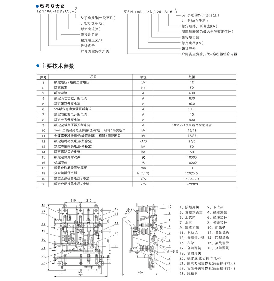 FZN16A- 12D/630型戶內交流高壓真空負荷開關及FZN16A- 12RD/200- 31.5型負荷開關-熔斷器組合電器性能達到GB3804-90<3~63kV交流高壓負荷開關>和IEC420<交流高壓負荷開關-熔斷器組合電器>(1990年版)國際標準及國家標準(報批稿)的要求。具有體積小、外形美觀、安裝靈活、操作力小、開斷安全可靠、電壽命長、可頻繁每操作、開斷轉移電流大、基本不需要維護,有明顯的隔離斷口且具有手、電動二用功能,可實現遠距離控制等優點。負荷開關-熔斷器組合電器還具有保護變壓器過載,防止設備缺相運行的功能。